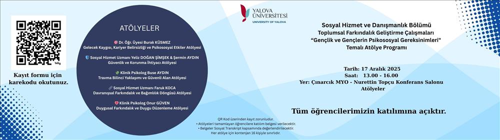 Yalova Üniversitesi Sosyal Hizmet ve Danışmanlık Bölümü tarafından, Toplumsal Farkındalık Geliştirme Çalışmaları kapsamında “Gençlik ve Gençlerin Psikososyal Gereksinimleri” Temalı Atölye Programı düzenleniyor. Program, gençlerin psikososyal ihtiyaçlarını farklı boyutlarıyla ele almayı ve bu alanda farkındalık oluşturmayı amaçlıyor.